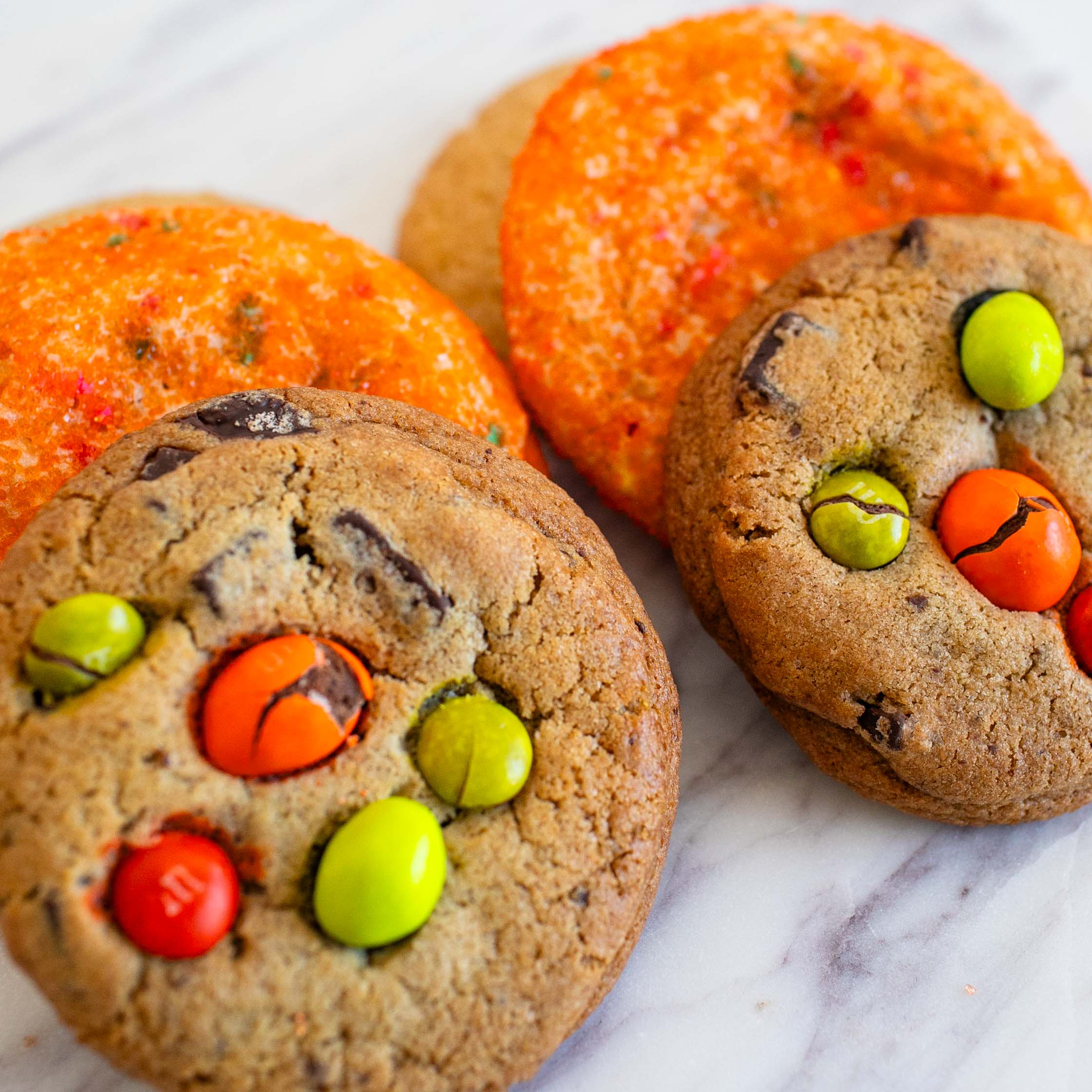 Our fall favorites feature brown-butter pumpkin snickerdoodles, rainbow cookies with orange sprinkles, and chocolate chip cookies with orange M&Ms—the best seasonal twist on timeless classics.