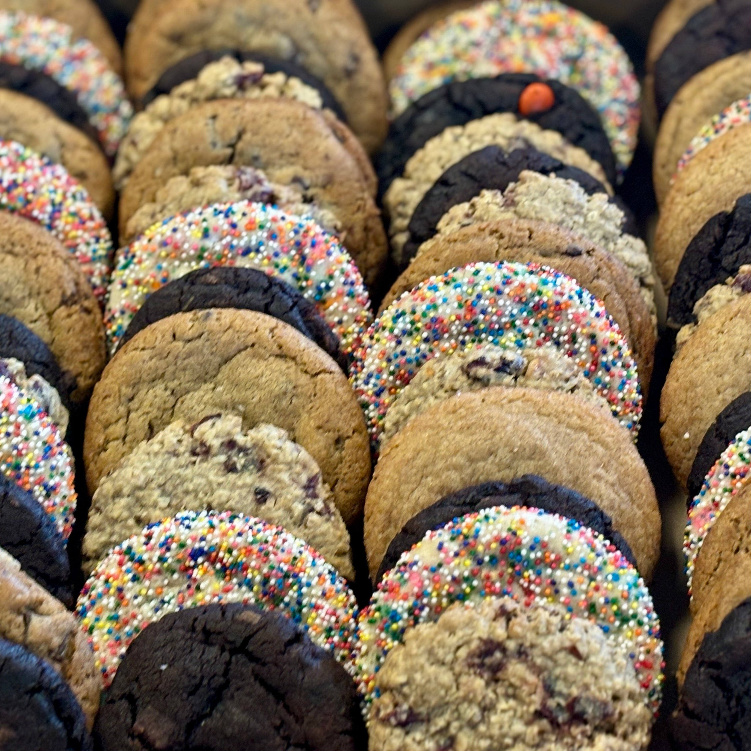 Each box contains an assortment of Toffee Snickerdoodle, Reece's Peanut butter, M&M double chocolate and Rainbow cookies.